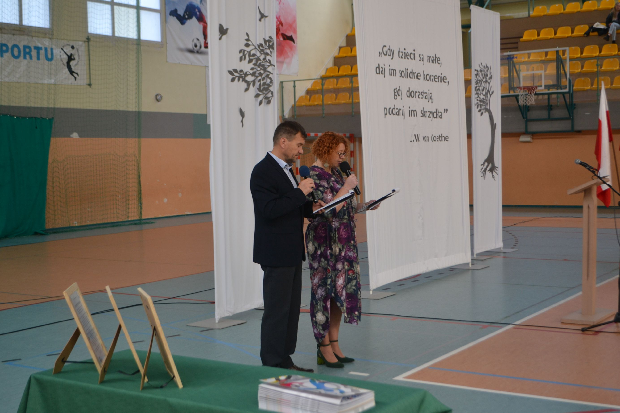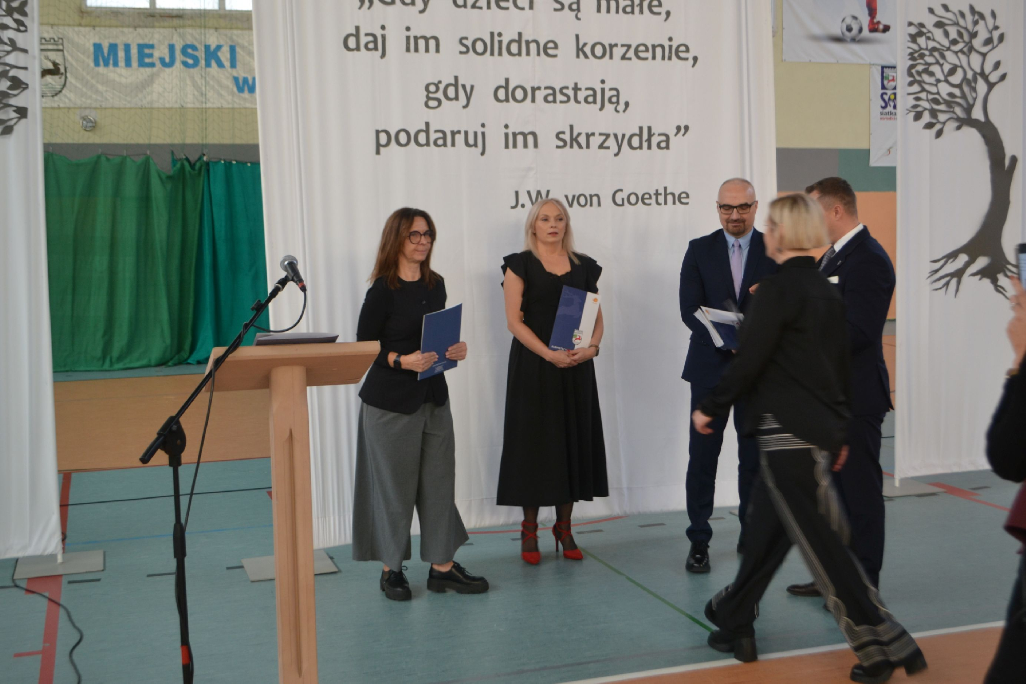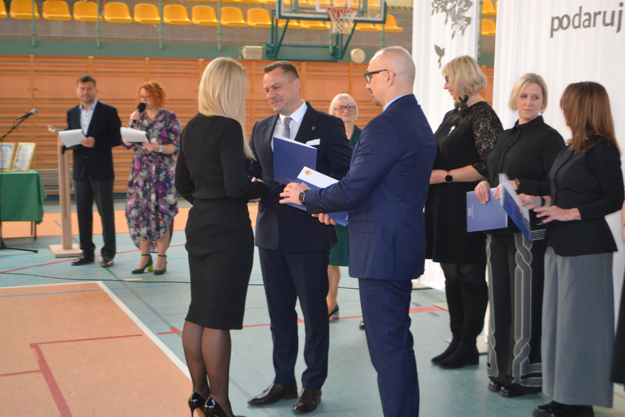 Na początek obchodów symbolicznie przywitaliśmy nowych pracowników. Tradycyjnie, częścią powitania było zadanie pytań o szkołę oraz o sport, co pozwoliło lepiej poznać nowych członków naszej społeczności i od razu poczuć integrację z uczniami i nauczycielami . To był moment pełen serdeczności, ciekawości i radości z powiększenia szkolnej drużyny.