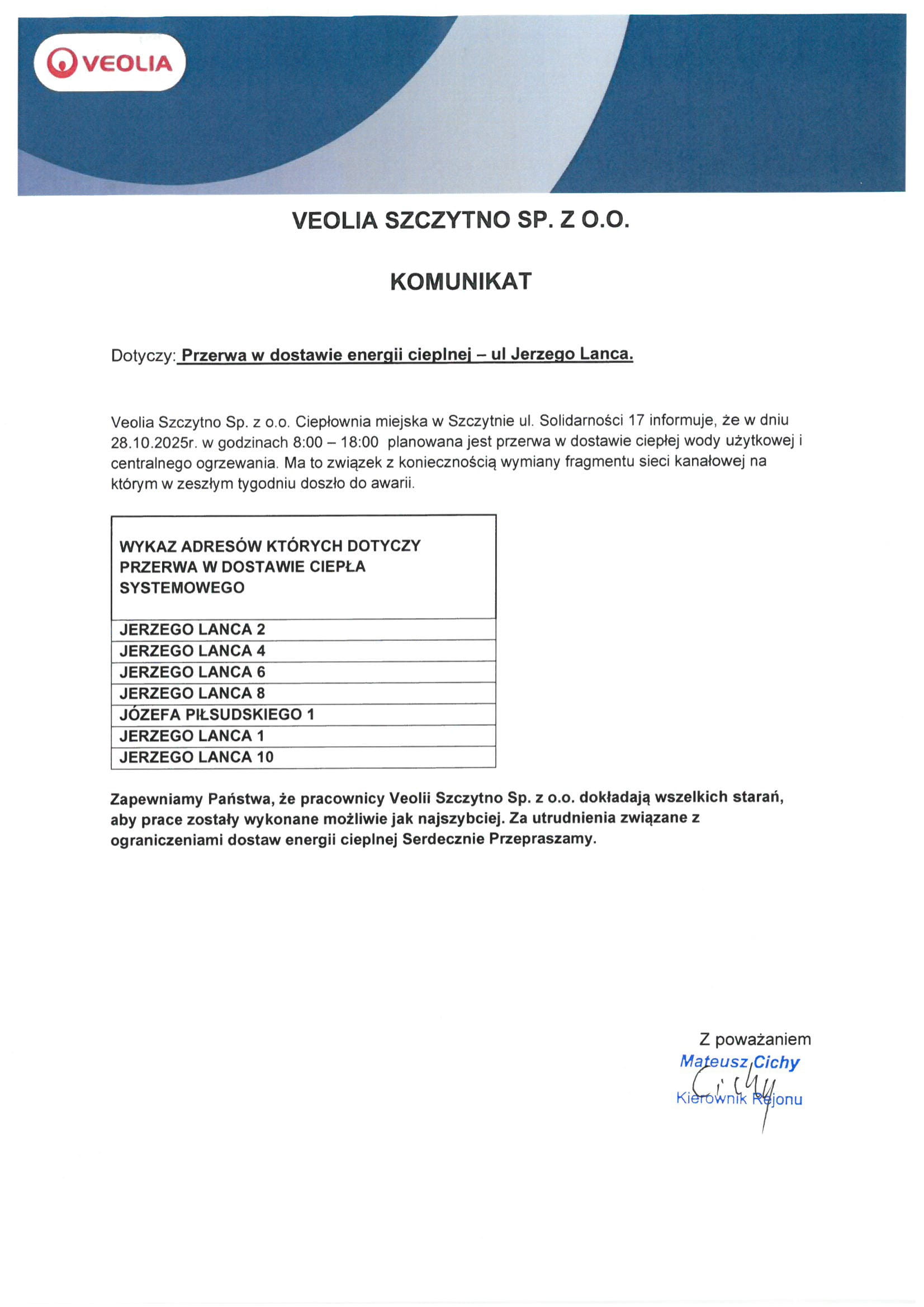 Komunikat - o przerwie w dostawie energii cieplnej w dniu 28.10.2025 r. w godzinach 8:00 - 18:00