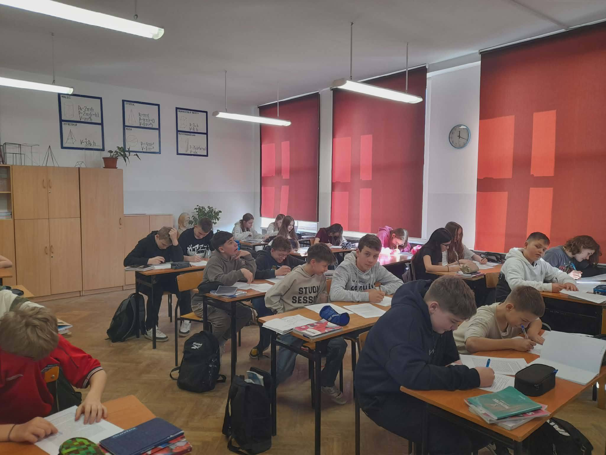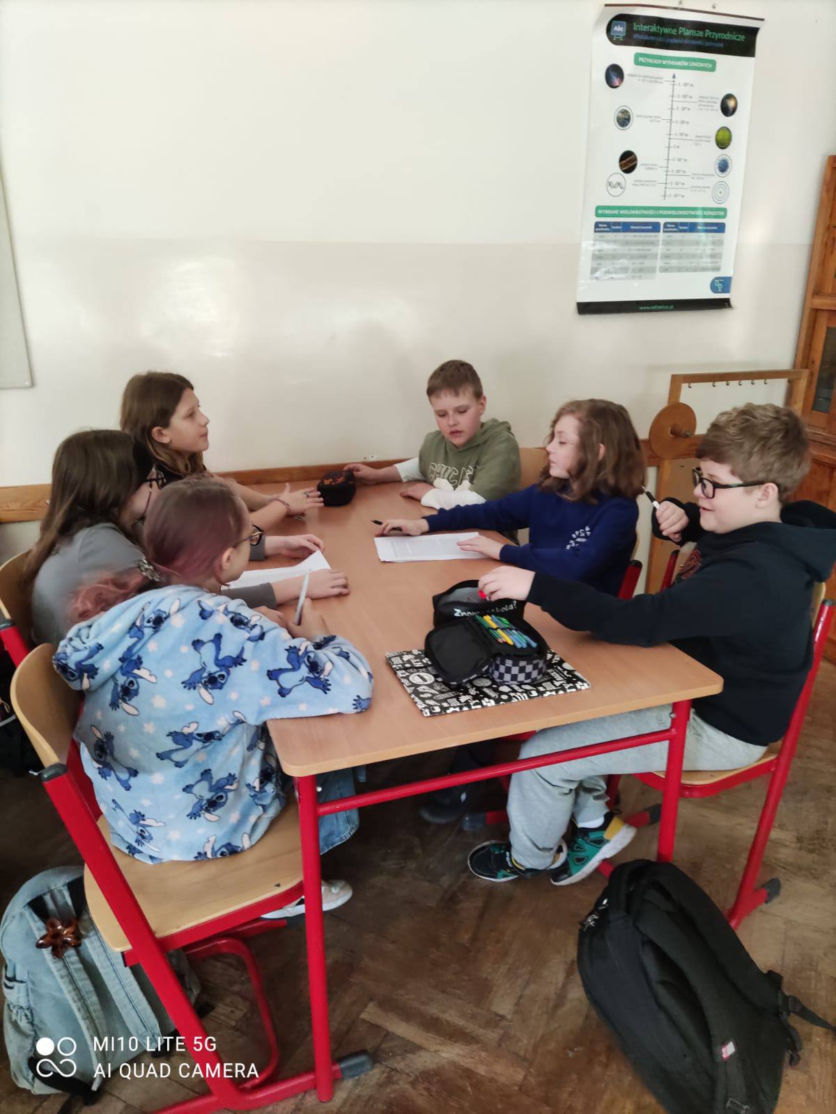 Klasy szóste i czwarte rozpoczęły zajęcia od obejrzenia filmu przedstawiającego historię liczby π. Następnie uczniowie rozwiązywali test sprawdzający zdobytą wiedzę – mogli pracować samodzielnie lub w grupach. Zadania dotyczyły ciekawostek, faktów historycznych oraz zastosowań liczby π w matematyce.
