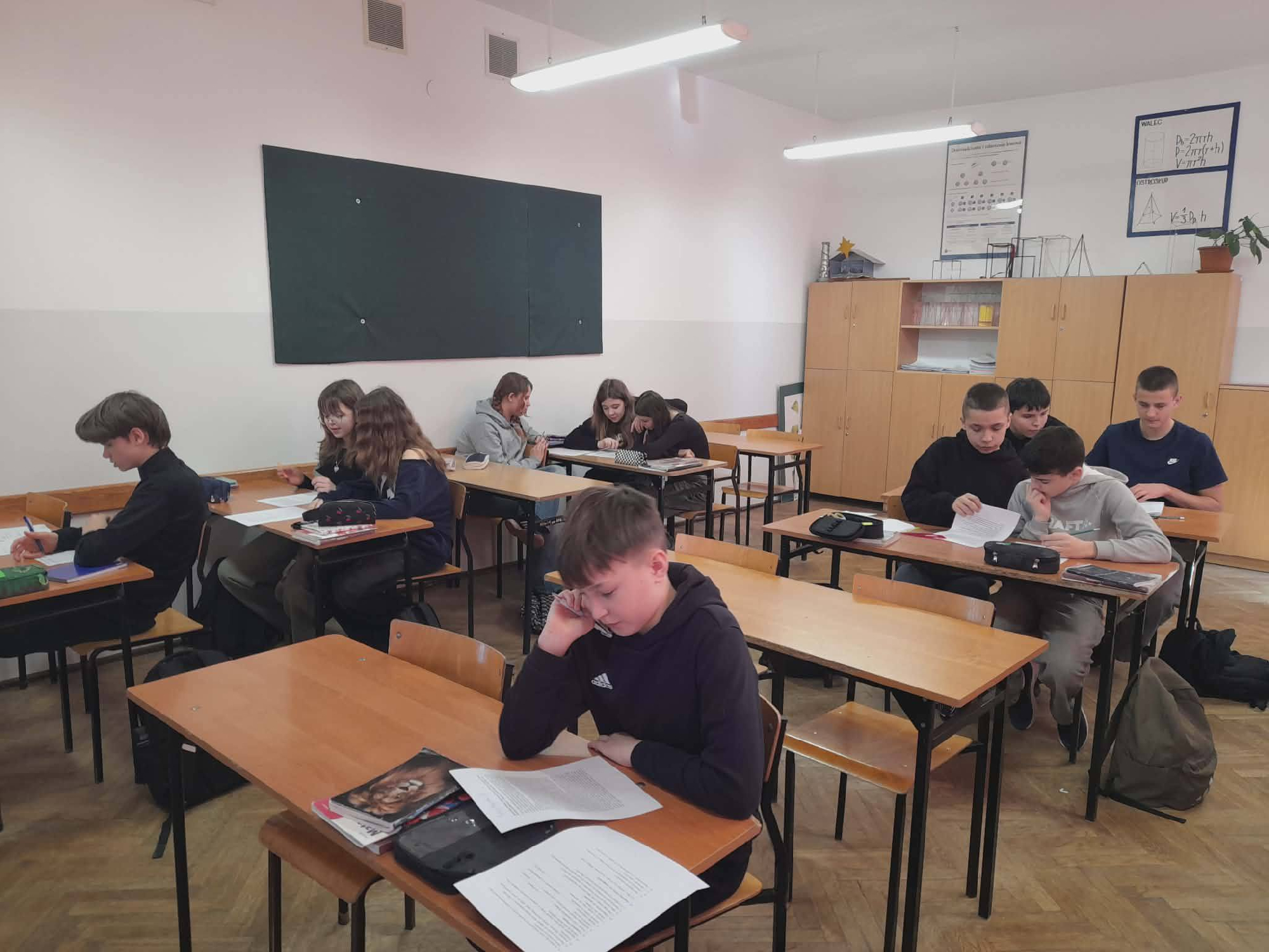 Uczniowie klasy 8 zmierzyli się z zadaniami matematycznymi związanymi bezpośrednio z liczbą π. Rozwiązywali różnorodne łamigłówki i obliczenia wymagające wykorzystania tej niezwykłej liczby, sprawdzając swoje umiejętności oraz logiczne myślenie.