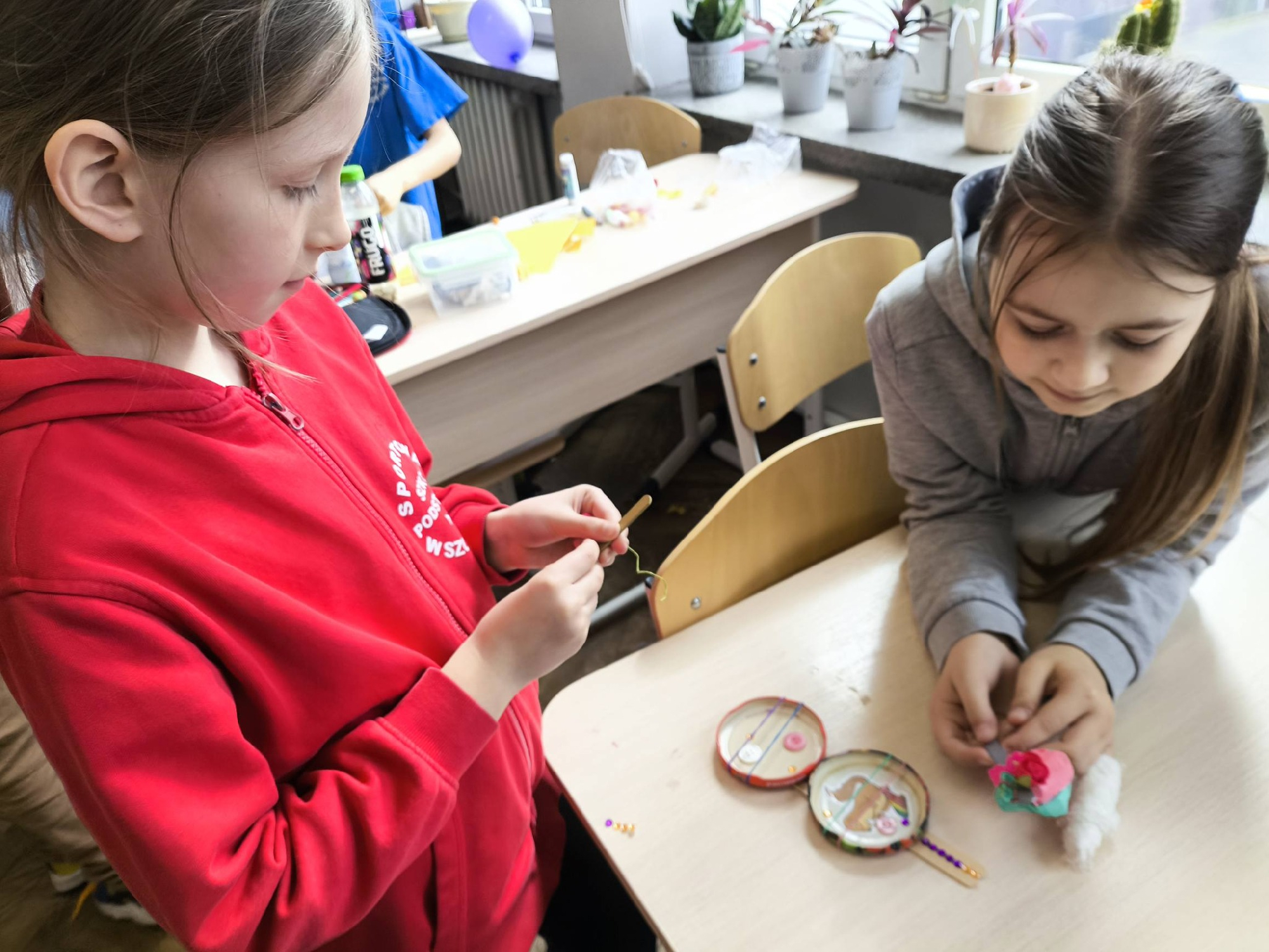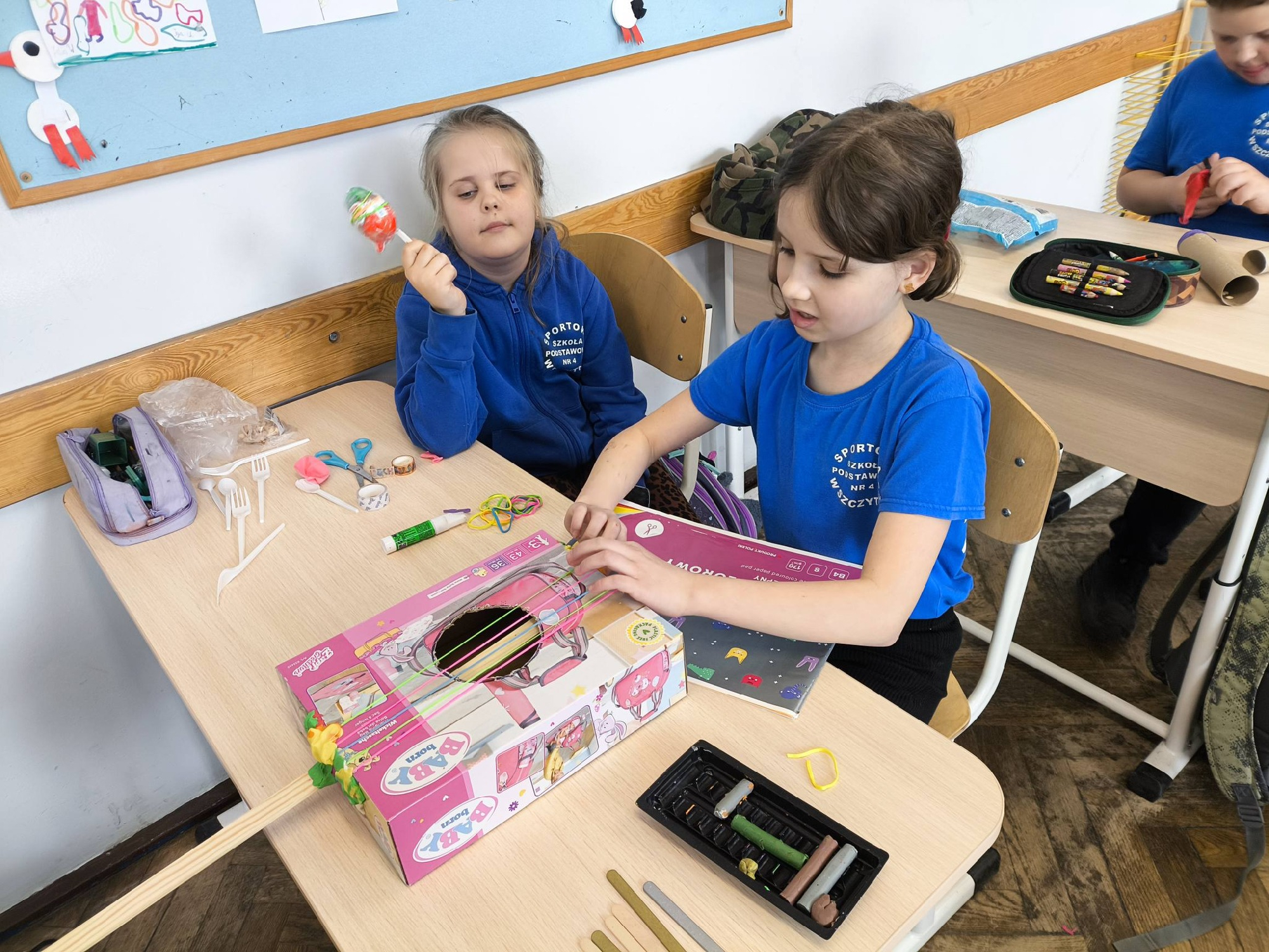 Pierwszym etapem pracy było wykonanie projektu - rysunku wraz z listą potrzebnych materiałów. Dzieci miały czas na zgromadzenie potrzebnych "składników", by na kolejnej lekcji zająć się już tylko realizowaniem swojego projektu. Powstały naprawdę ciekawe i kolorowe instrumenty, które nie tylko pięknie wyglądają, ale również i przede wszystkim- grają