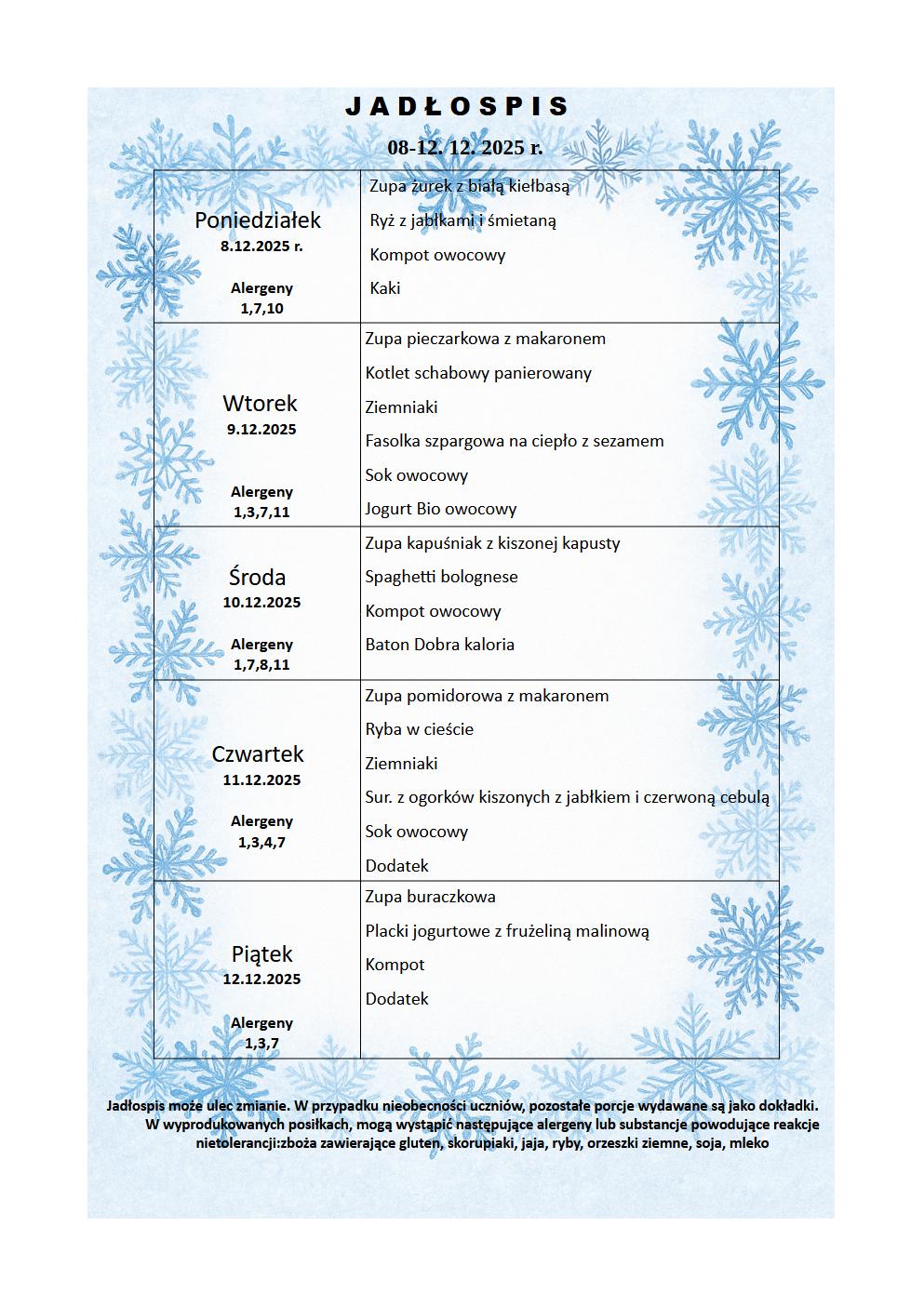 Jadłospis może ulec zmianie. W przypadku nieobecności uczniów, pozostałe porcje wydawane są jako dokładki.